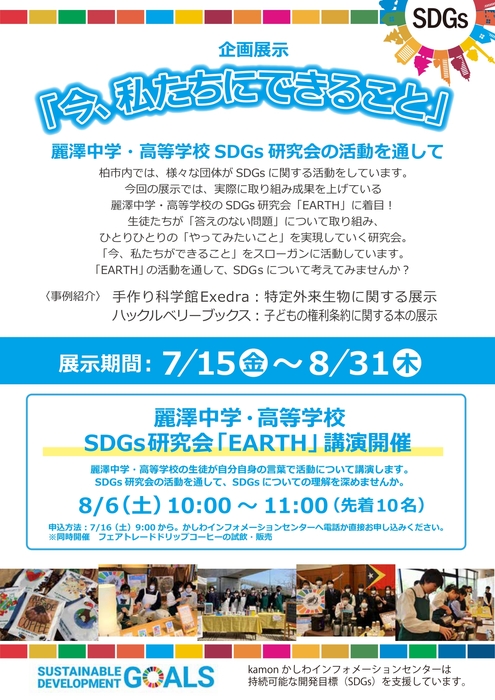 麗澤中学・高等学校(千葉県柏市/校長:櫻井 讓)のSDGs研究会「EARTH」が、未来を担う10代の目線から自分たちの経験を元にSDGsについて理解を深める講演会を8/6(土)10:00~11:00kamonかしわインフォメーションセンターにて実施します。