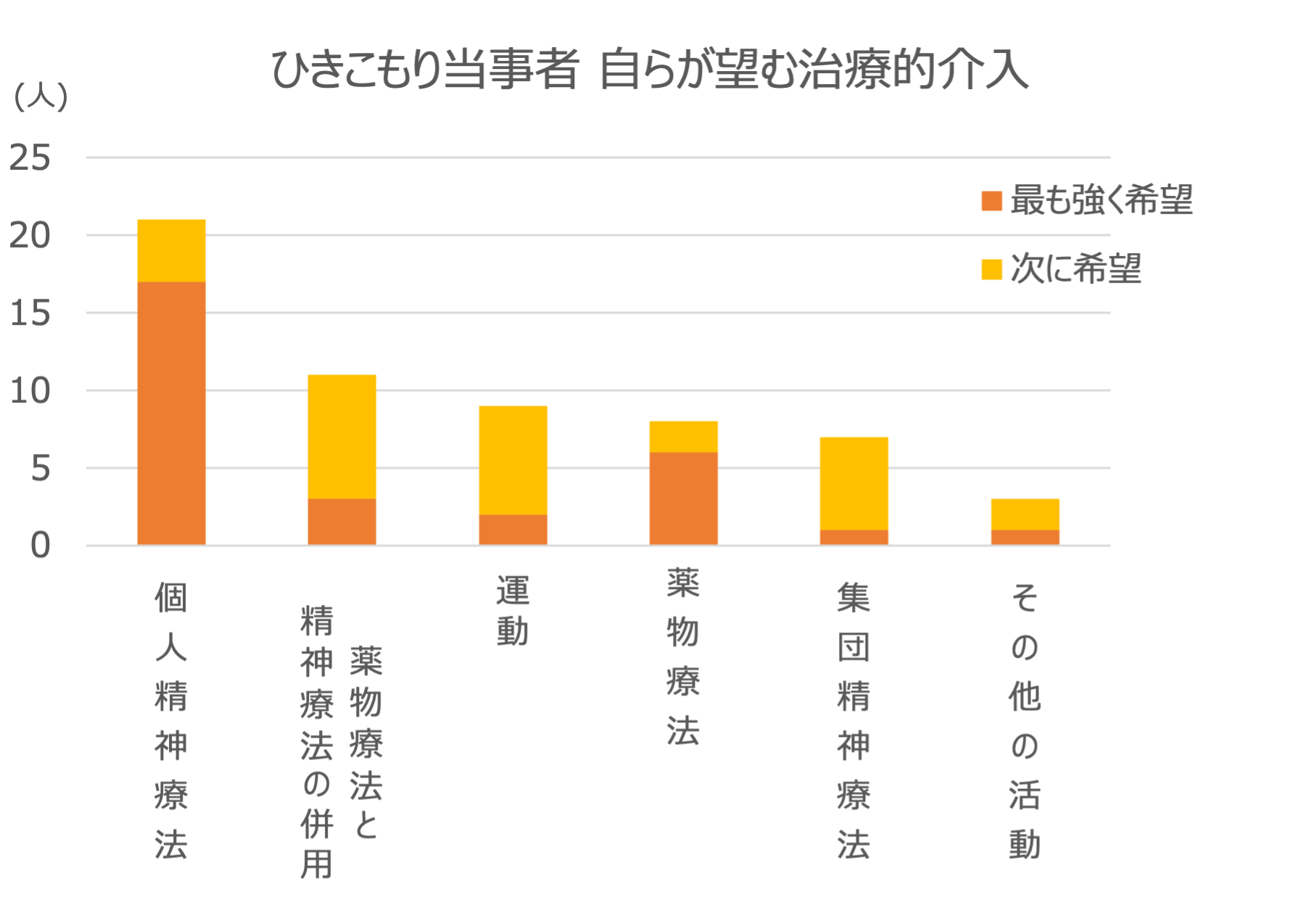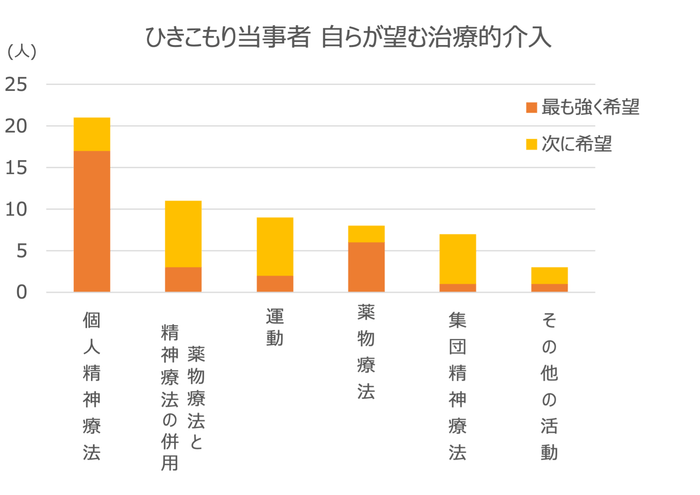九州大学医学研究院精神病態医学分野 准教授 加藤隆弘医師の研究*3によると、ひきこもり当事者に多い精神疾患は回避性パーソナリティ障害・うつ病・PTSD・社交不安症で、全体の77%が何らかの精神疾患を罹患していました。また、多くのひきこもり当事者(78%)が、ひきこもり打開のための何らかの治療を望んでおり、薬物療法よりも精神療法(カウンセリング)を希望する人が多いことがわかりました。
