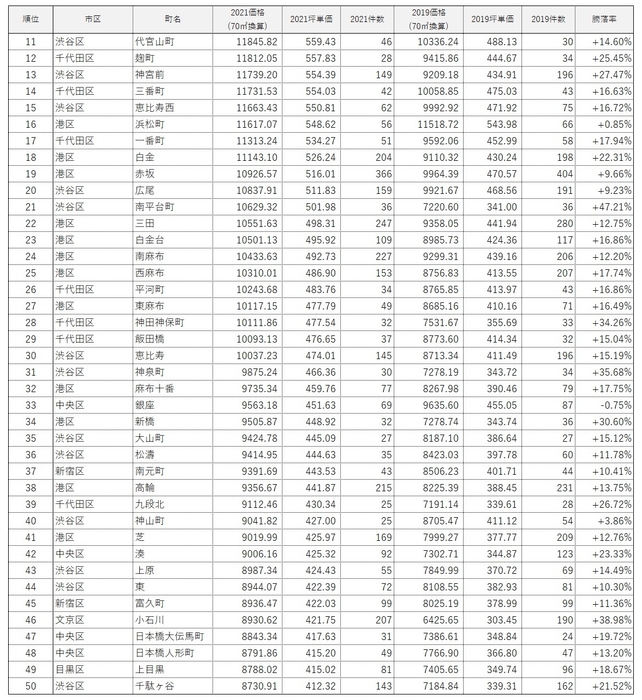 ・1位は「渋谷区宇田川町」の+58.29%。70㎡換算推定価格は1億3,461万9,400円で、コロナ前の2019年と比較して約5,000万円上昇。2020年竣工の「パークコート渋谷ザ タワー」が相場を大きく牽引した。