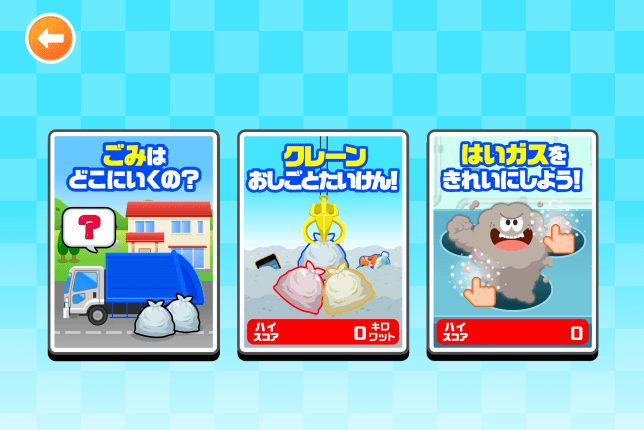 本ゲームは、「ごみはどこにいくの?」、「クレーンおしごとたいけん!」、「はいガスをきれいにしよう!」の3つのゲームで構成され、いずれも生活に身近なごみ処理について、ゲームを通して楽しく学んでいただけます。