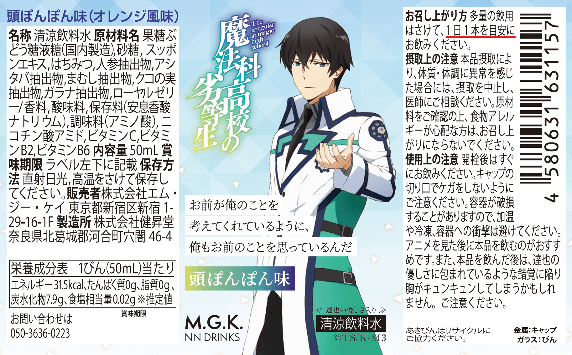 「生ホイップは飲み物(R)」の企画・販売を行う、株式会社エム・ジー・ケイ(本社:東京都新宿区、代表取締役:山崎 将史)は、2024年7月17日(水)に、アニメ「魔法科高校の劣等生」の主人公である司波達也に頭をぽんぽんされたらという妄想を形にした「お前が俺のことを考えてくれているように俺もお前のことを思っているんだ 頭ぽんぽん味」(清涼飲料水)を発売いたします。