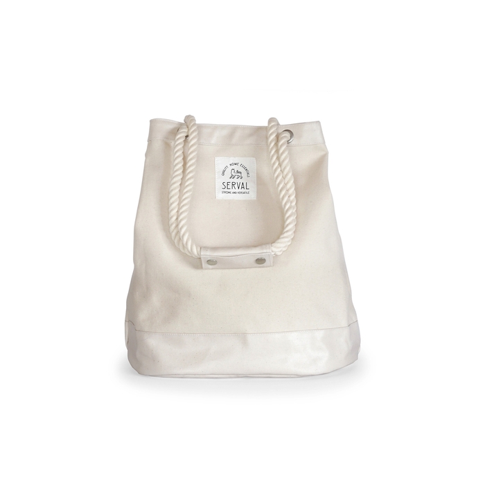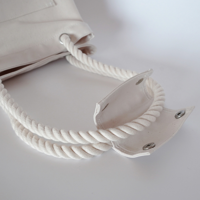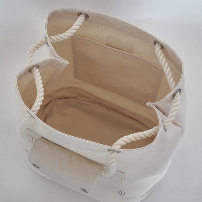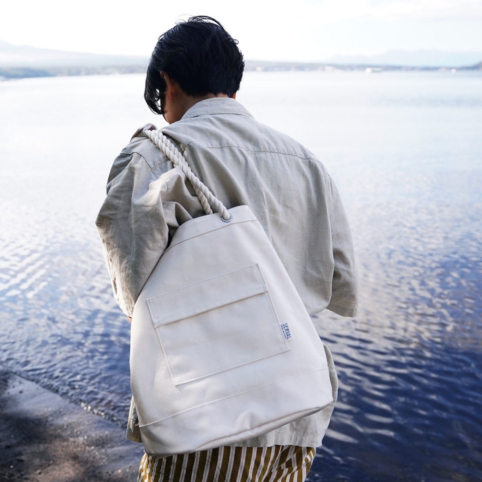 船乗りのダッフルバッグをデザインのベースにした、マリンテイストのトートバッグです。生地には、帆布の規格のなかで最も薄い11号帆布に、片面が塩化ビニールコーティングで防水加工されたものを採用しています。防水面をバッグの内側と底、取手部分に使用。重量は380gと、とても軽やか。タフさと軽やかさを兼ね備えた汎用性の高いバッグです。