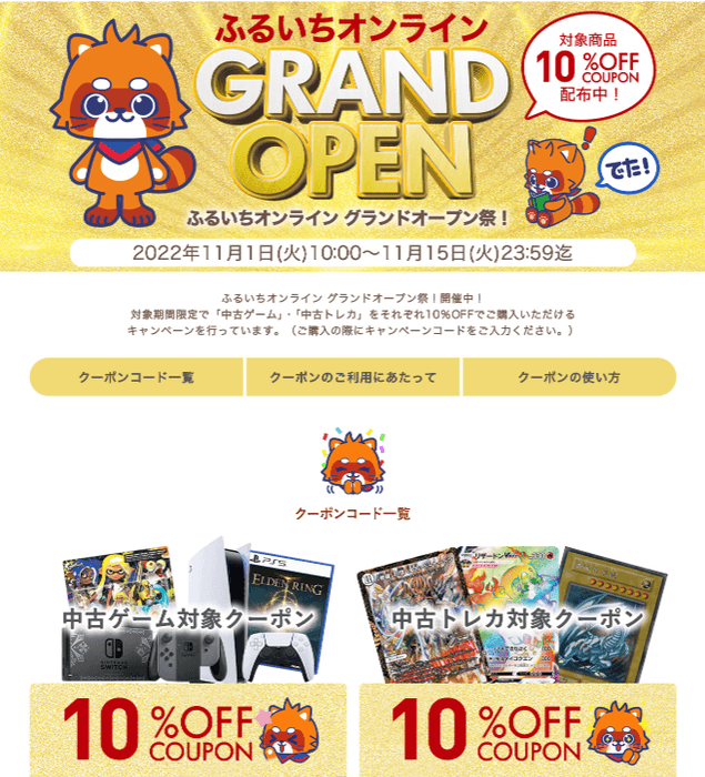 中古ゲーム、中古トレーディングカードが全品10%OFF! 古本市場公式ECサイト ふるいちオンラインが贈る 初のビッグセール第1弾を11月1日より15日間限定で開催