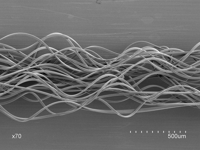 この特徴を実現する為、東レ独自の複合紡糸技術NANODESIGN®を駆使し、成分の異なる3種類のポリマーを精密に配列した扁平C型断面ポリエステル繊維を開発しています。