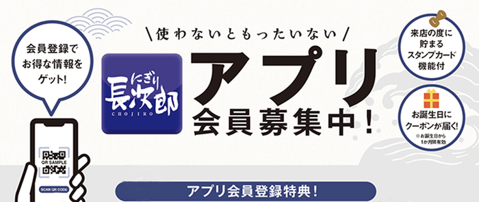 にぎり長次郎をお得にご利用できる、公式アプリを配信しています。