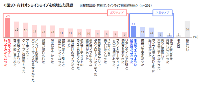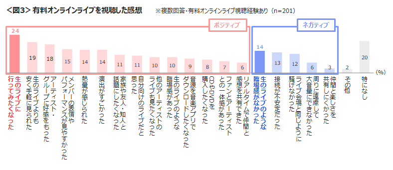 有料オンラインライブを視聴したポジティブな感想は「生のライブに行ってみたくなった」、ネガティブな感想は「生のライブのような臨場感がなかった」。