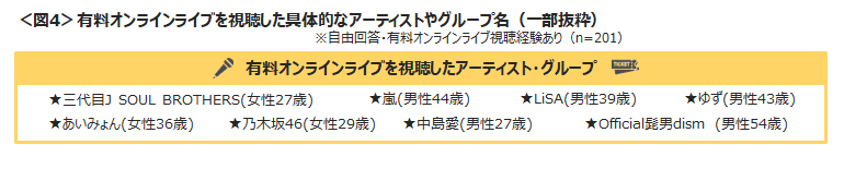 また、具体的に視聴したアーティストは、「嵐」「乃木坂46」「Official髭男dism」といったバラエティに富んだグループの視聴が見られた。<図4>