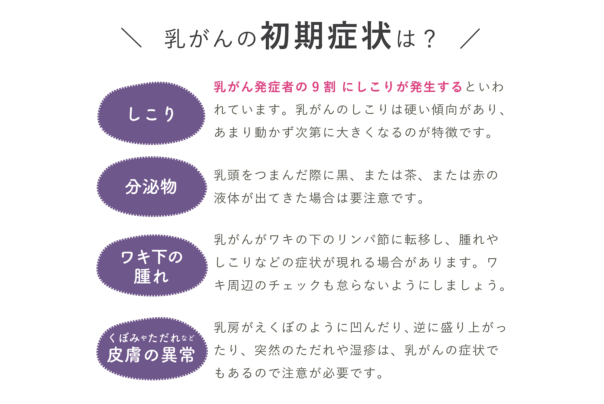 乳がんは、乳腺に発生する悪性腫瘍です。しこりや分泌物、皮膚のくぼみやただれといった初期症状を見逃すと、がん細胞は増殖し、乳腺の外や他の臓器に広がるリスクがあります。