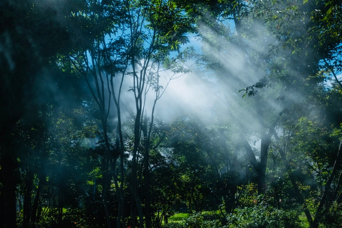 ・昼:柔らかな霧が広がり、緑豊かなガーデンと調和する幻想的な光景を演出。