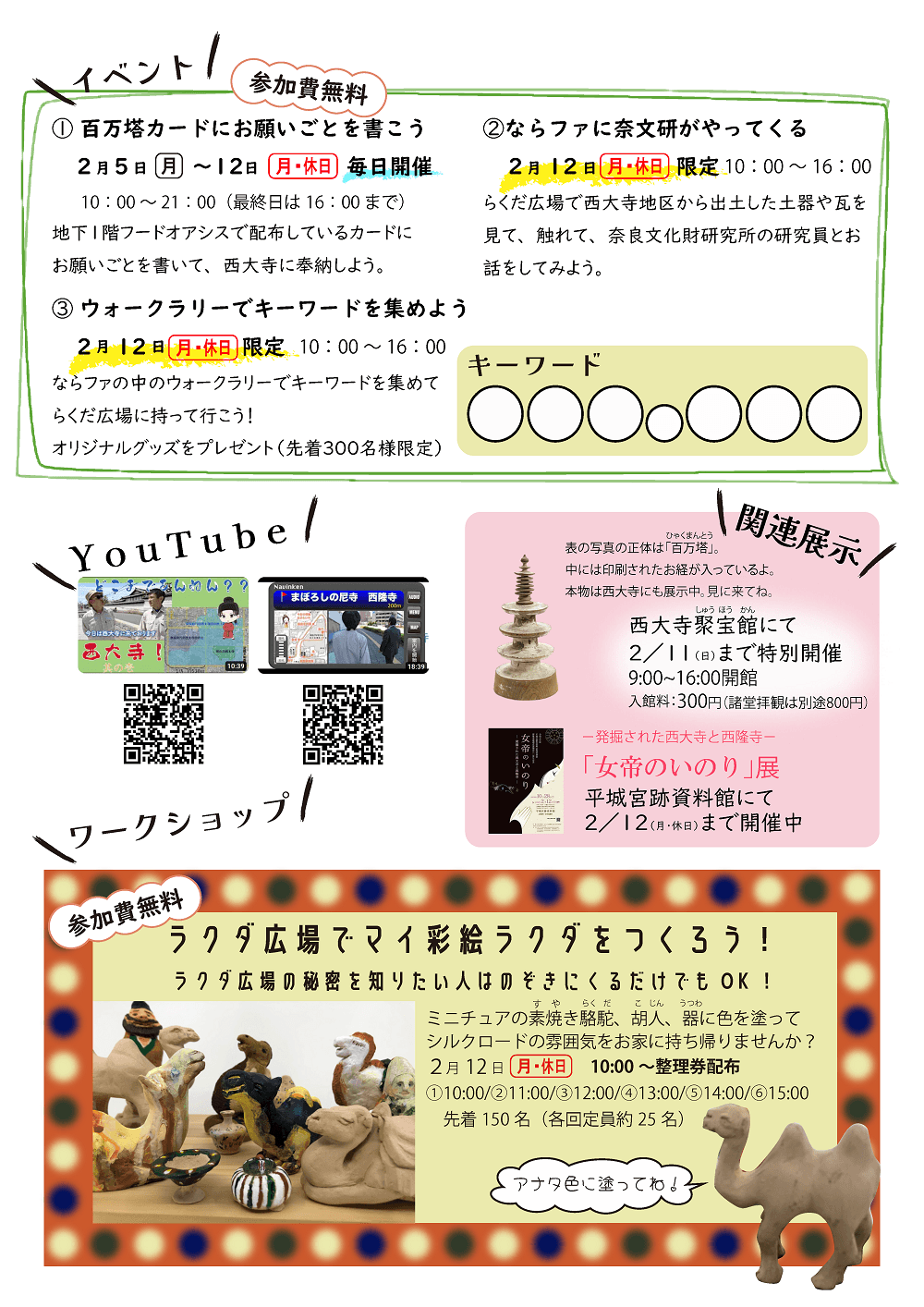 さらに、最終日の12日(月・休日)は館内のパネルをめぐってオリジナルグッズをゲットできるウォークラリーや、西大寺で出土した土器や瓦を展示!らくだ広場ではラクダの色絵付け体験もあります。