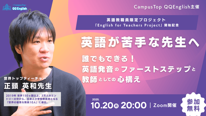 株式会社QQ English(本社:東京都新宿区、代表取締役:藤岡頼光、以下QQEnglish)は、2025年10月20日(月)20:00から 、英語教職員限定のオンラインセミナー「誰でもできる発音練習のファーストステップと教師としての心構え」を実施いたします。