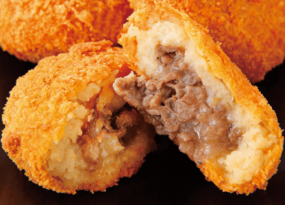 このコロッケの一番の特徴である牛肉をしっかり味わっていただくため、スライスした牛肉を入れ、まるで肉じゃがのような味わいに仕上げています。