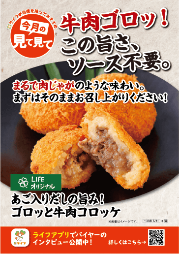 【ライフ】首都圏&近畿圏で共同開発第1弾!食文化の違いを超えたおいしさ!「あご入りだしの旨み!ゴロッと牛肉コロッケ」誕生