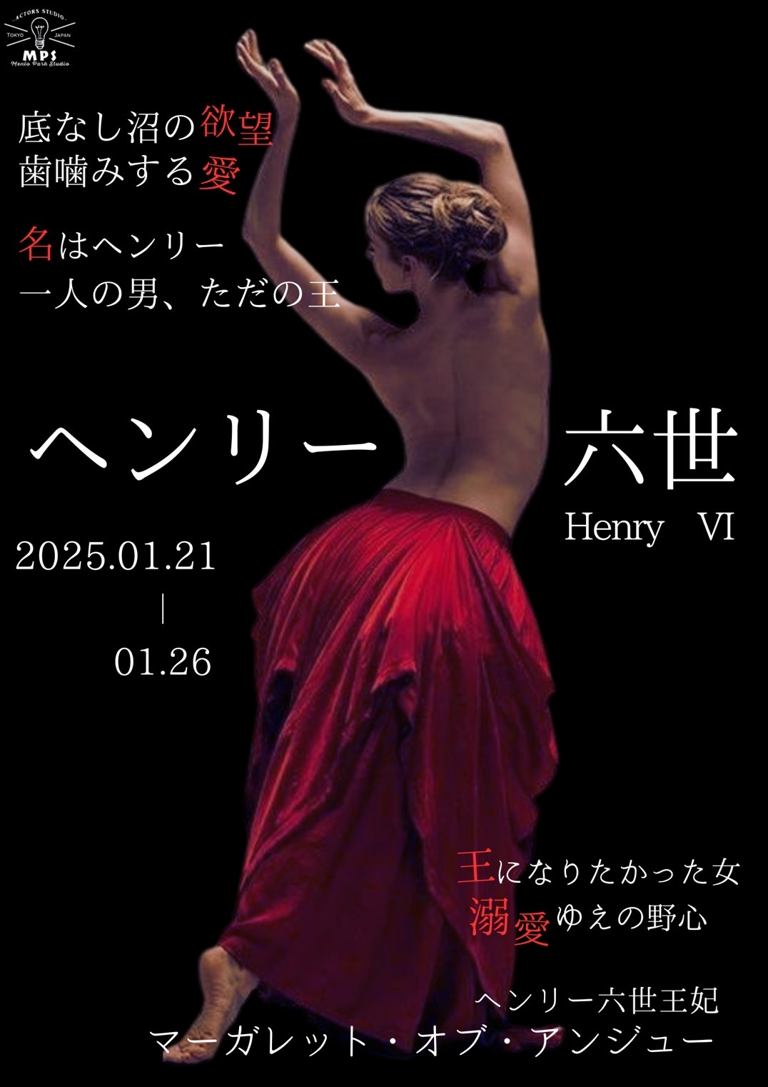 合同会社MPS主催、『ヘンリー6世』—底なし沼の欲望 歯噛みする愛 名はヘンリー 一人の男、ただの王—が2025年1月21日 (火) 〜 2025年1月26日 (日)にブルースクエア四谷(東京都 新宿区 若葉 1丁目1-1 若葉大原ビル地下1階)にて上演されます。