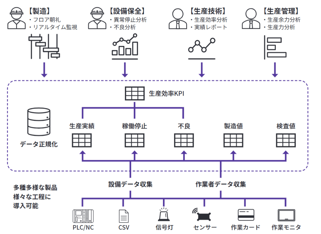 導入にあたっては、まずパイロットラインで小規模に開始し、効果を検証した上で全社的な展開へとスムーズに拡張できるため、投資対効果を見極めながら組織全体の生産性向上を図ることができます。さらに、異なる設備や製品を跨いだデータ標準化をワンパッケージで実現し、複数ラインや製品を統合して全体最適化を支援します。
