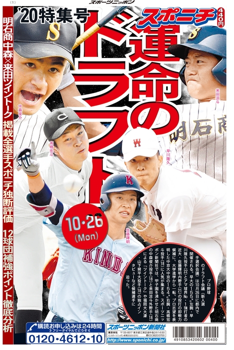 10月26日に東京都内で開催されるプロ野球のドラフト会議(新人選手選択会議)。今年は早大の155キロ左腕・早川隆久投手、アマ球界№1スラッガーの近大・佐藤輝明内野手、大学進学から一転、プロ志望を表明した中京大中京の154キロ右腕・高橋宏斗投手に人気が集まりそうです。「’20年ドラフト特集号」では先に挙げた3選手を詳報するほか、福岡大大濠・山下舜平大投手の独占インタビュー、明石商・中森俊介投手、来田涼斗外野手ツイントークなど1位候補から隠れた逸材まで、全国の取材網を駆使して余すことなく取り上げています。「スポニチ式 プロ野球12球団補強ポイント徹底分析」も注目です。