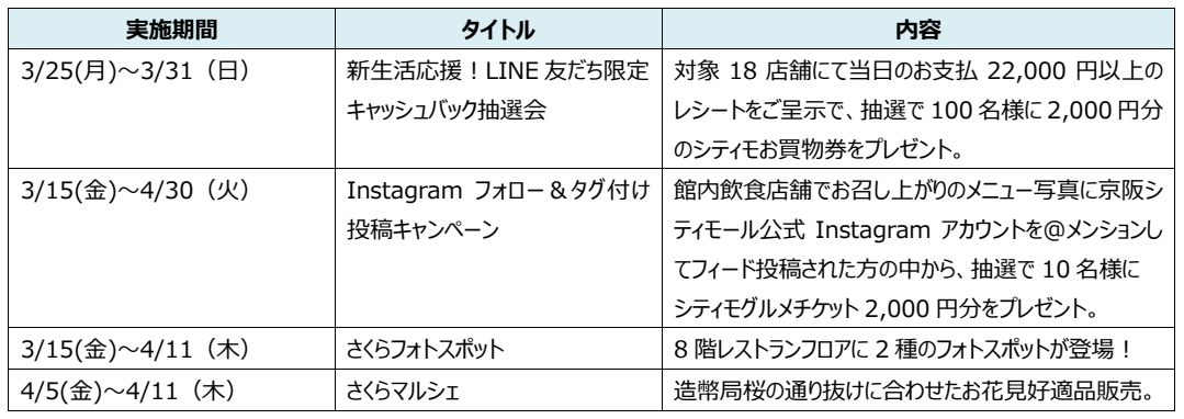 さらに、館内でゆっくりと楽しい時間をお過ごしいただけるように地下1階イートインスペースの美装化やさくらフォトスポットの設置を実施し、よりくつろぎを感じられる心地よい施設へと進化いたします。ぜひ、この機会に京阪シティモールをご利用くださいませ。
