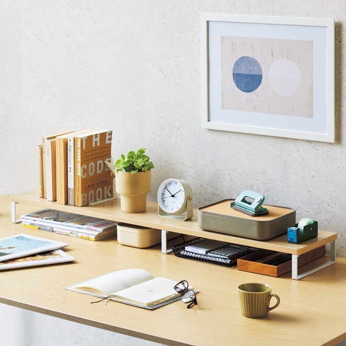机上の棚としても使用可能する等、ワイド幅でスペースを有効活用可能。