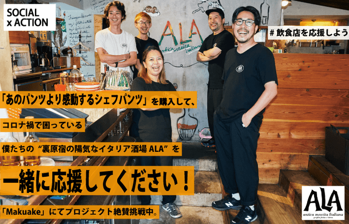 仲間との楽しい時間や大切な人との素敵な時間を。時に悲しい時には元気と勇気を。飲食店はいつも僕たちの心と胃袋を元気づけてくれました。しかし、このコロナによる影響は凄まじく、皆さんの身近にある多くの飲食店が今窮地に立たされています。だから、僕たちに出来る手段で「コロナ禍で困っている飲食店を応援したい!」ただその強い想いだけで、利益度外視で走り出したプロジェクトです。僕たちと一緒に「裏原宿の陽気なイタリア酒場 ALA」を応援していただけませんか?僕たち「SOCIAL×ACTION(TM)」は、『飲食店を応援し続けます。』