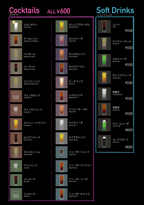 AXE THROWINGとSHISHAと一緒につまめるフライドポテト等の軽食を用意しています。ドリンクは、瓶ビール、カクテル、ソフトドリンクと多種多様にお楽しみいただけます。