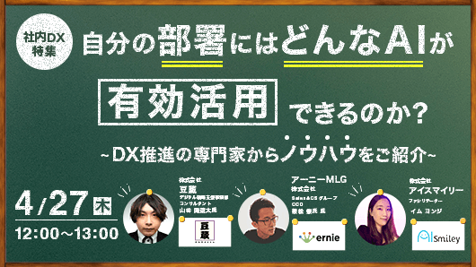 企業のDXを推進する国内最大級の AI ポータルメディア「AIsmiley」を運営するアイスマイリー(東京都渋谷区、代表取締役:板羽晃司)は、2023年4月27日(木)12時から社内DX特集ウェビナーを開催します。
