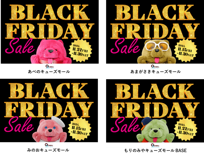 「キューズモール」4施設(あべのキューズモール・あまがさきキューズモール・みのおキューズモール・もりのみやキューズモールBASE)の各施設では、2024年11月中旬より順次、お得にお買い物をお楽しみいただける「BLACK FRIDAY SALE(ブラックフライデーセール)」を実施します。