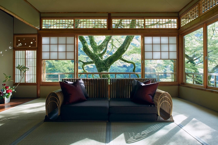 平安貴族が別邸を構えた京都府・嵐山。渡月橋から船に乗り、大堰川を遡ると現れる水辺の私邸。京都に息づく日本の伝統技法を感じる客室、五味を自在に表現する