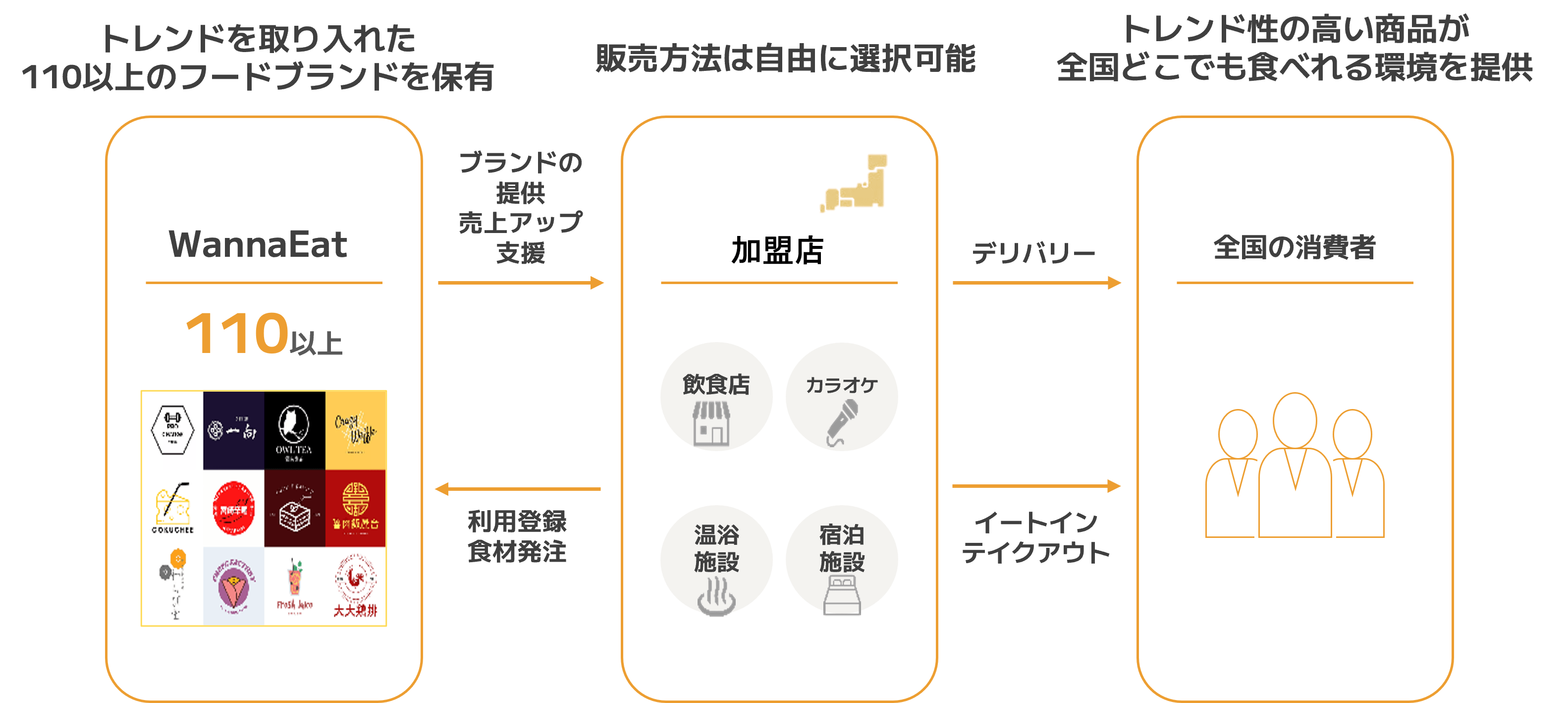 当社は話題のスイーツ・ドリンクや人気店の料理など110種類以上のフードブランドを開発しています。「フーシェア」は飲食店のほか、カラオケや温浴施設など飲食店営業許可を持つ全国の店舗・施設が加盟店となり、フードブランドを店舗のメニューとしてイートインやテイクアウトで消費者に販売できるほか、デリバリープラットフォームでも販売可能なサービスです。