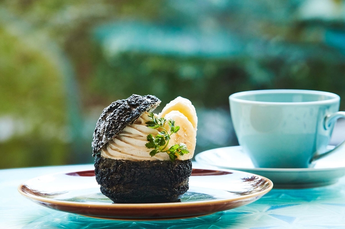 レストラン自慢の薪グリルをイメージし、お茶の香ばしさを楽しめる静岡産の茶炭を使用したユニークな黒いさくさくのシュー生地の中央にたっぷりとクリームを挟んだシュークリームです。茶炭のシュー生地に合わせ、4月、5月の季節特製のクッキーシューをお楽しみいただけます。
