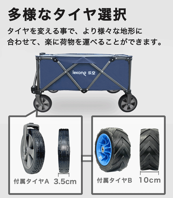 なんと工具を使わずにタイヤの切り替え・着脱が可能。道路の状況にあったタイヤを選べます。草地・砂利道・砂地もOK!タイヤを外せば収納BOXとしても使えます。