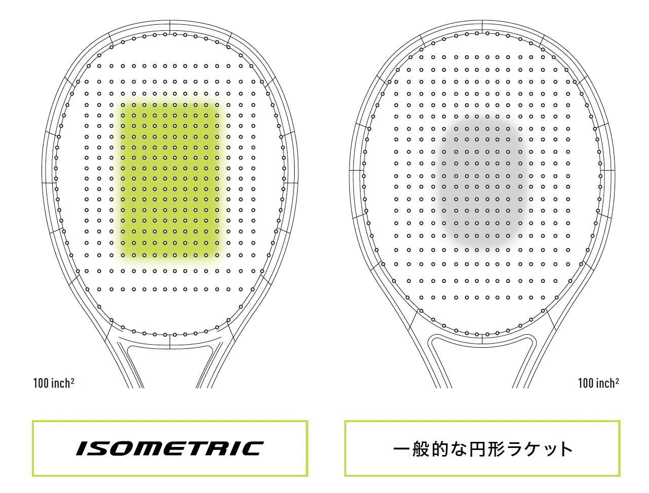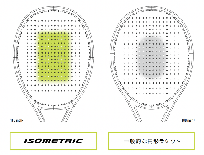 アイソメトリックとは、スウィートエリアを拡大させるヨネックス独自の形状理論。縦横のストリングの長さを均等に近づけることで、一般的な円形ラケットに比べ上下左右に7%※広いスウィートエリアを実現。