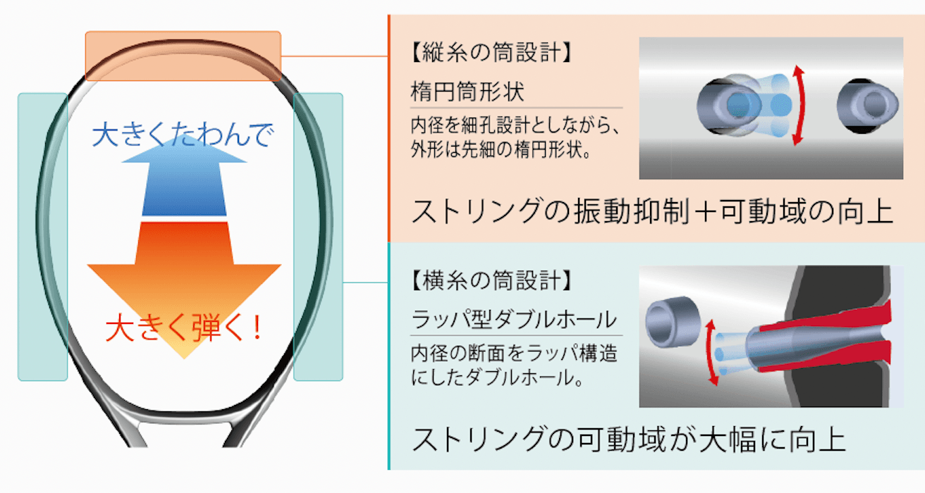 フレームは、弊社独自の形状理論「アイソメトリック」を採用し、一般的な円形ラケットに比べ上下左右に7%※2広いスウィートエリアを実現しています。シャフト部には、素早い復元力を生む新素材「2G-Namd™ Speed(ツージーエヌアムド スピード)」※3を搭載することで、適度なしなりで柔らかさを維持しながら、より高い反発性能を発揮。加えて、ストリングの振動を抑制しつつ可動域を向上させた新グロメット設計で弾き性能を高め、ボール飛距離が5.0%※1アップしました。