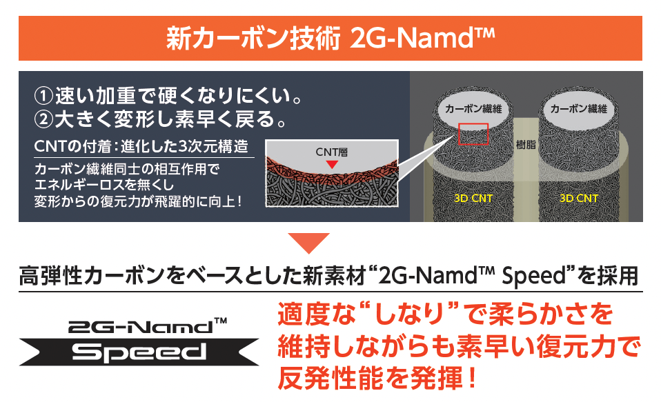 ※3 Namd™及び2G-Namd™は、ニッタ㈱が開発した「ナノ分散カーボンナノチューブを炭素繊維へ均一複合化」する技術です。2G-Namd™ Speedは、Namd™の CNT 層構造を 3 次元構造へと進化させた 2G-Namd™を適用することにより、変形からの復元力が飛躍的に向上しました。Namd™及び2G-Namd™はニッタ㈱の日本における登録商標です。
