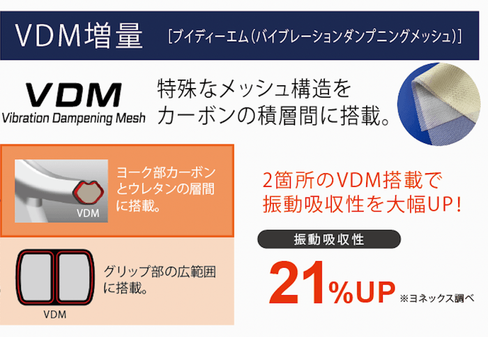 また、特殊なメッシュ状の振動吸収素材「Vibration Dampening Mesh(VDM)」を従来のグリップ部に加え、ヨーク部カーボンとウレタンの層間に内蔵。新構造により衝撃吸収性が大幅にアップし、柔らかい上質な打球感を生み出します。