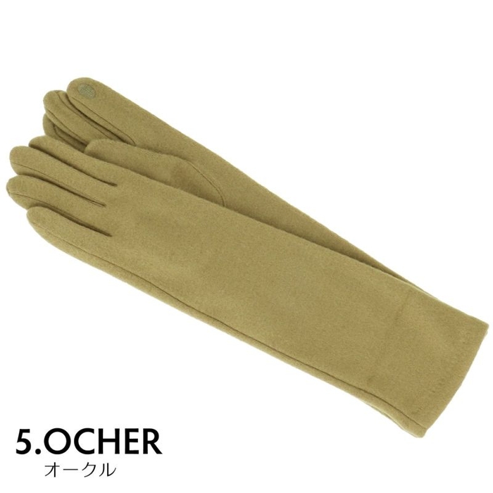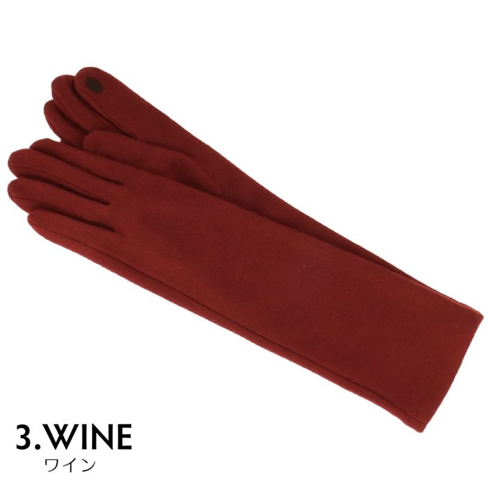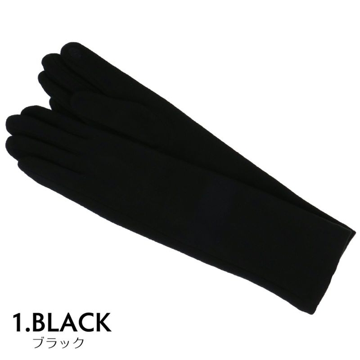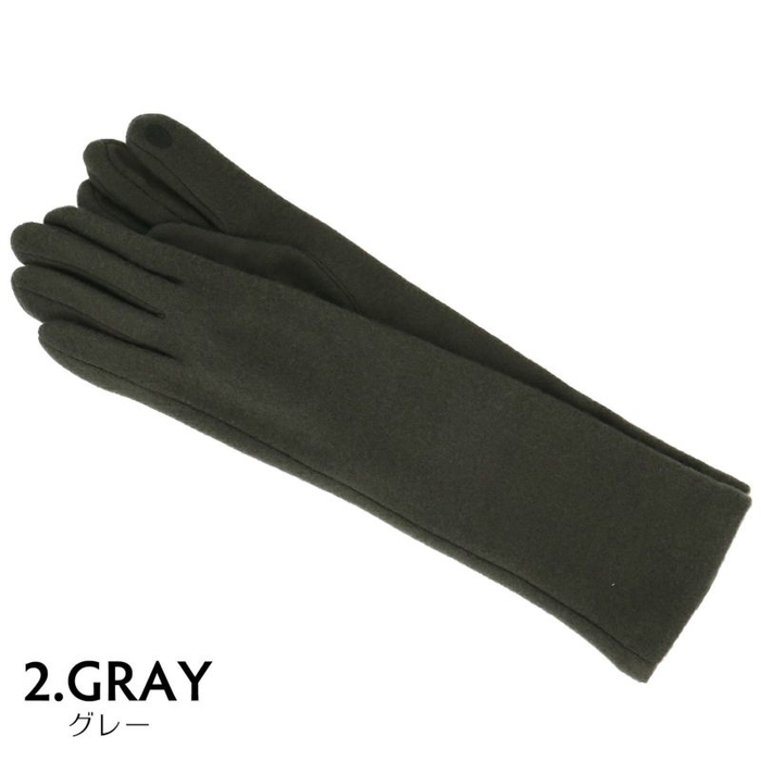 やわらかなアクリル生地。親指と人差し指の指先に、地の色と同系色のタッチパネル対応刺繍。シンプルなデザインで、着物の防寒にばっちりのロングタイプ手袋です。