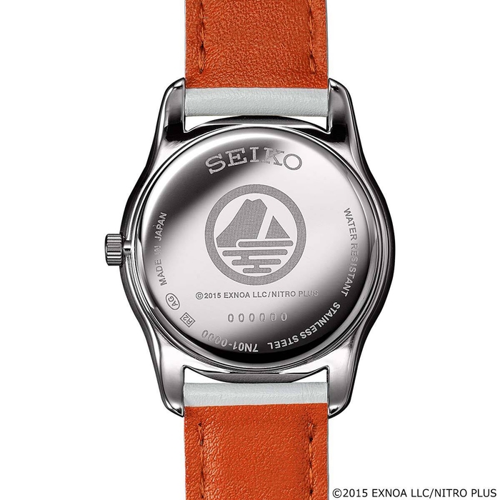 バンドの裏地には、飾り帯と同じ橙色を忍ばせて。刀に刻まれた銘さながらに、裏蓋にはセイコーのロゴと刀剣男士紋が刻印されます。