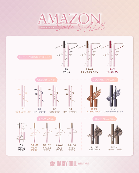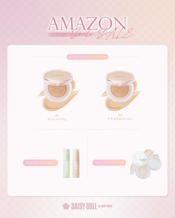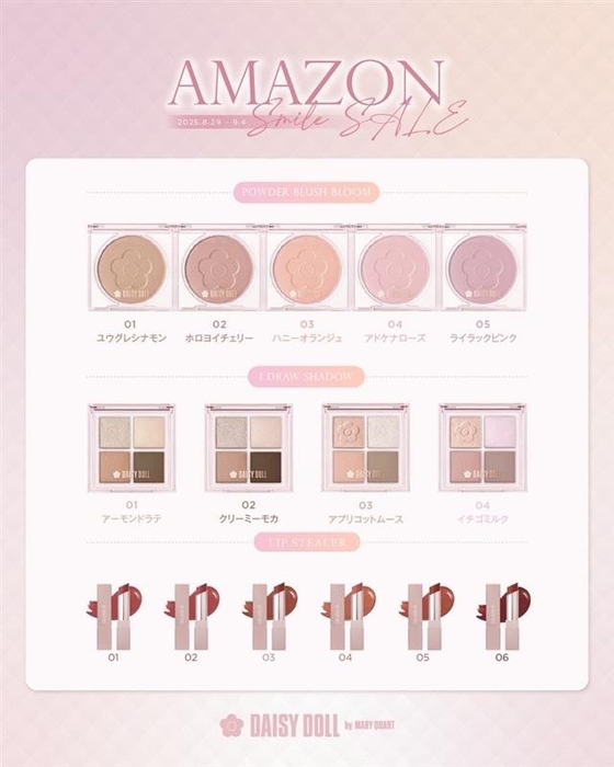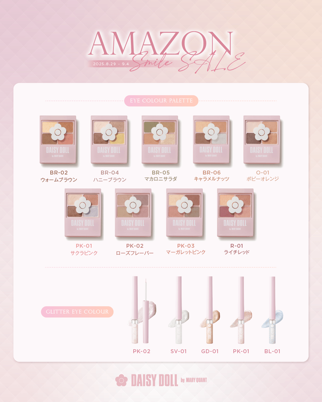 2025年9月4日(木)23:59まで、Amazon スマイルSALEでデイジードールが10%オフ!かわいいメイクアイテムをお得にゲットできるチャンス♪期間限定のスペシャルプライスをお見逃しなく!