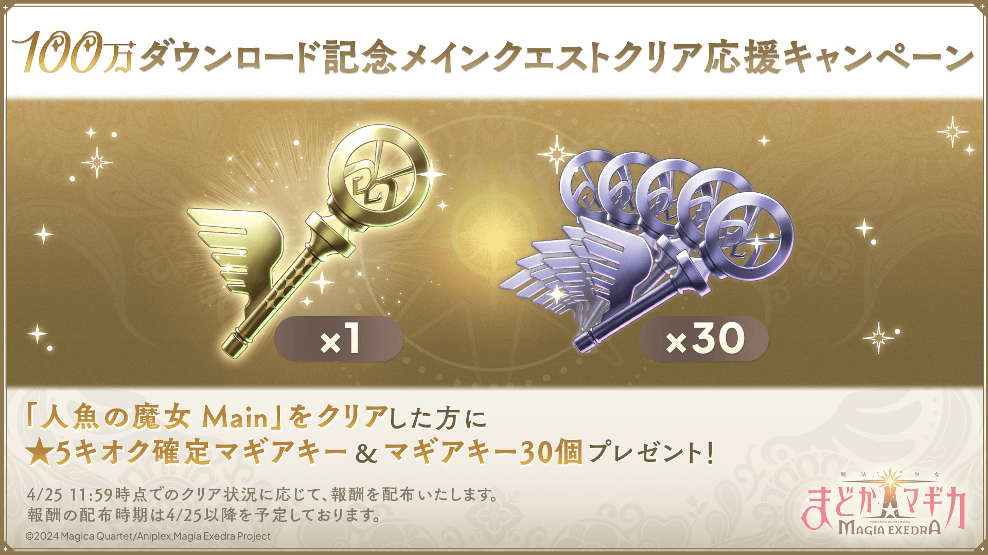 先日100万ダウンロードを突破したことを記念して、メインクエストのクリア状況に応じてマギアキー最大30個、さらに★5キオク確定マギアキー1個を獲得できるキャンペーンを開催中です。