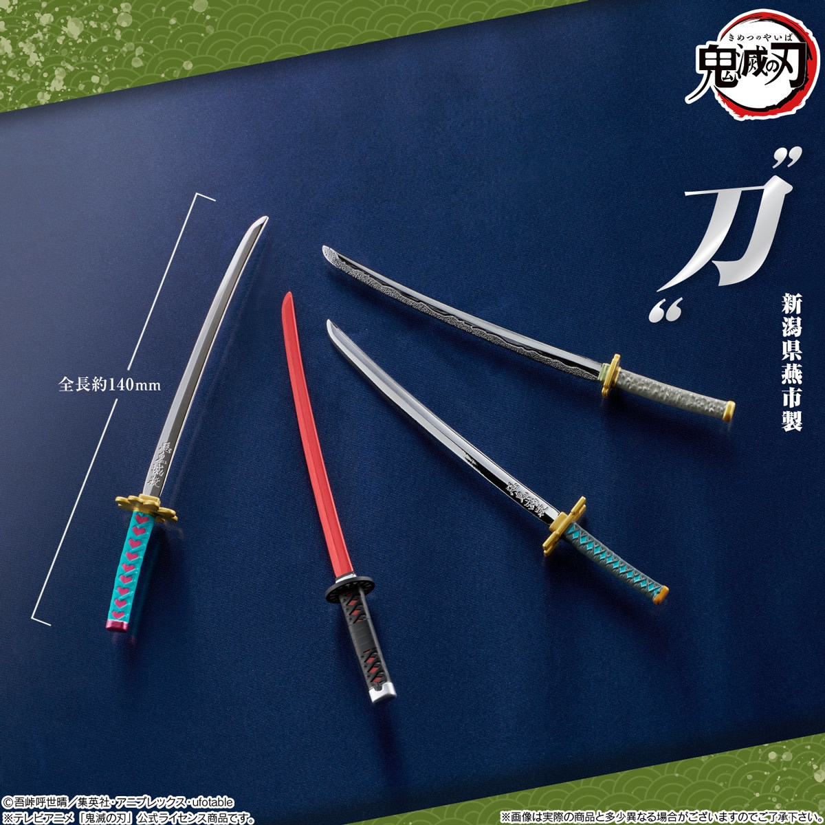 菓子切の刀身は、実際に羊羹を“斬る”ことができる全長約140mmの金属製仕様で、金属食器で名高い新潟県燕市で製造されたものです。今弾では竈門炭治郎の爆血刀に加え、甘露寺蜜璃・時透無一郎の日輪刀、そして縁壱零式の刀をラインナップ。4種の刀は、それぞれ刀身だけでなく鍔・柄においても忠実に再現しています。また、鋼鐵塚蛍が刀を研ぐ際に用いる砥石をイメージした菓子切置も付属します。