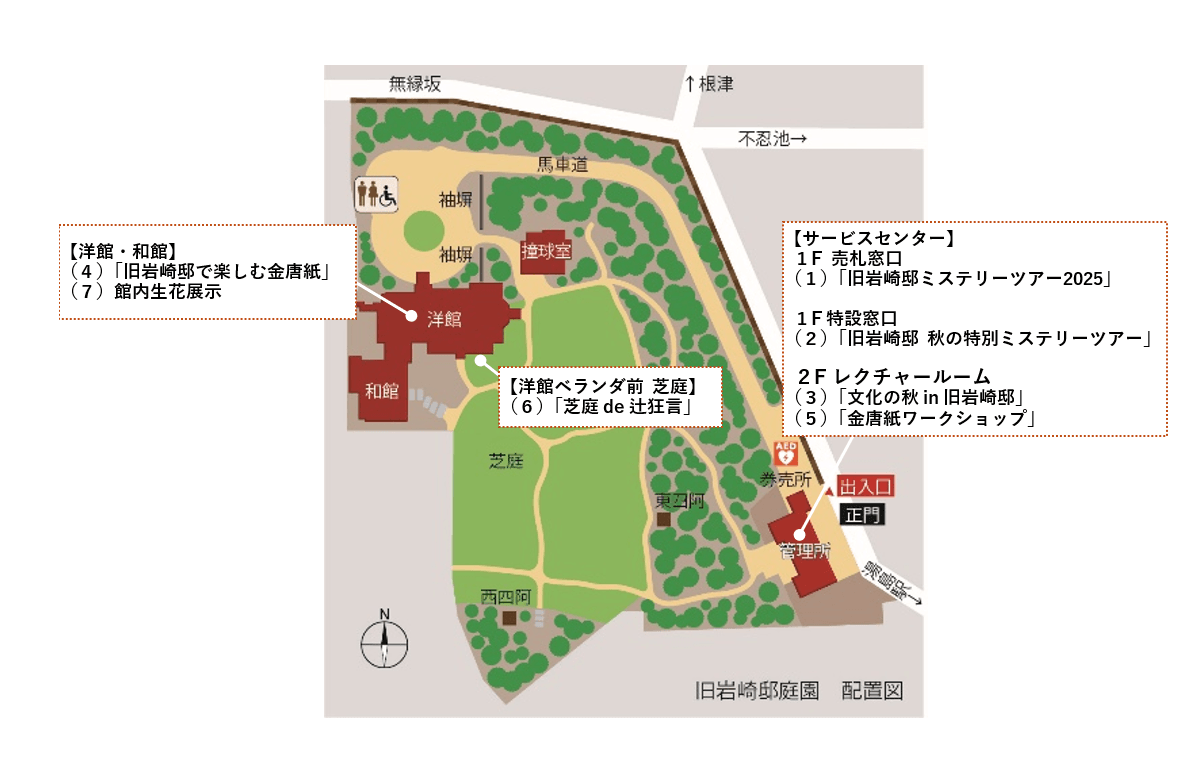 ・荒天または雨天などの場合、イベントや一部サービスを中止・休止・変更することがあります。ご来園前に旧岩崎邸庭園公式ホームページ・公式X(旧Twitter)にて最新情報をご確認ください。