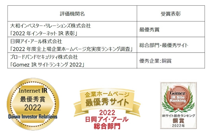 大和インベスター・リレーションズ(株)「2022年インターネットIR表彰」など3つの主要なIRサイト評価機関において2022年度も高評価を獲得