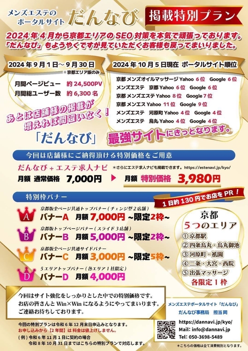 だんなび企画(所在地:北区梅田1-2-2 大阪駅前第2ビル2階)は、メンズエステ店舗向けに特別な掲載プラン「だんなび京都版」を提供開始します。この業界注目のプランは、店舗のオンライン視認性を高め、潜在顧客に効率的にアプローチすることが可能です。特に京都エリアに特化したSEO対策により、ポータルサイトでの順位が上昇し、多くのお客様の目に留まることが期待されます。
