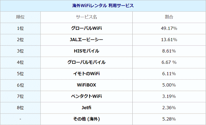 海外Wi-Fiレンタルサービスを利用された方でトップはグローバルWiFiが49.17%と最も高く、次いでJALエービーシーの13.61%、HISモバイルの8.61%となりました。