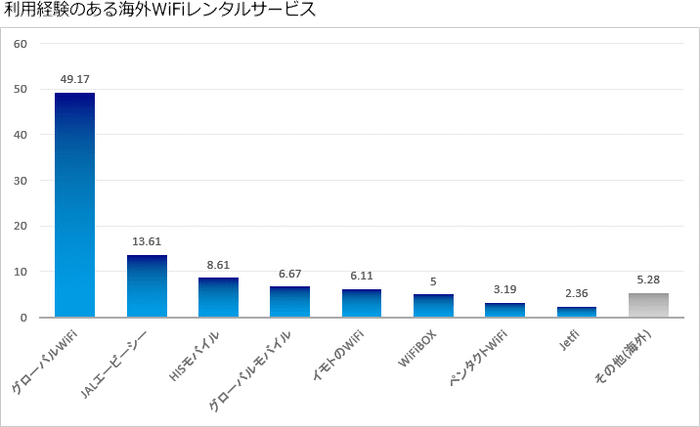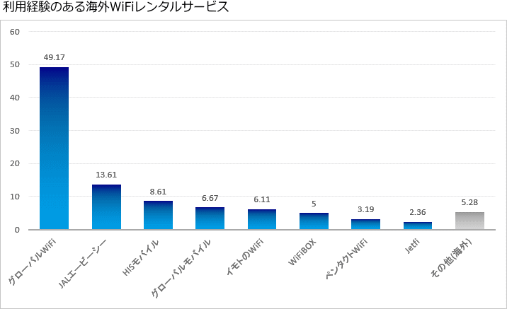 海外Wi-Fiルーターレンタル専用サービスとしてシェアの高いグローバルWiFiの利用経験者数の多さが際立つ結果です。