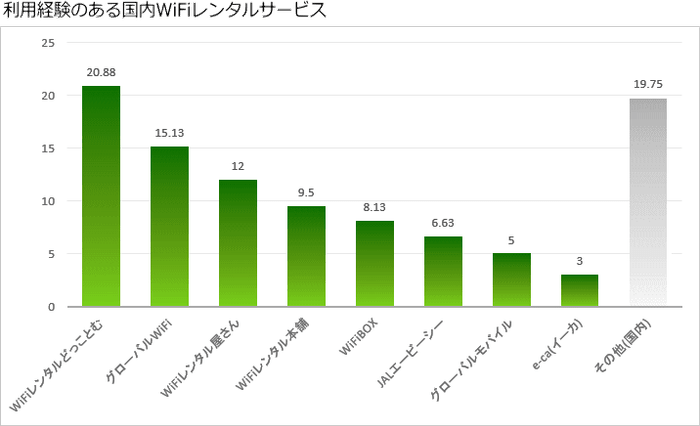 国内Wi-Fiレンタルサービスを利用された方でトップはWiFiレンタルどっとこむが20.88%、次いでグローバルWiFi・国内用が15.13%、WiFiレンタル屋さんの12%となりました。