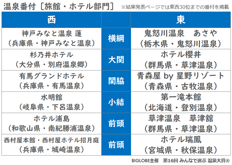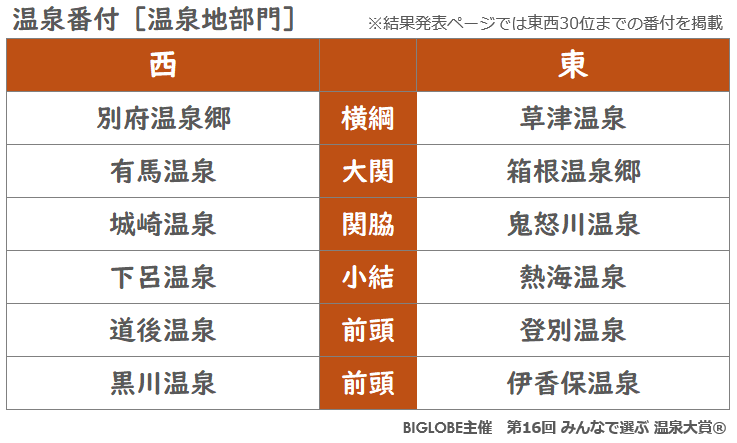温泉地部門では草津が16年連続、別府が9年連続で東西の横綱に BIGLOBE主催「第16回 みんなで選ぶ 温泉大賞(R)」結果発表 ~旅館・ホテル部門の東西横綱は 「神戸みなと温泉 蓮」と「鬼怒川温泉 あさや」に決定