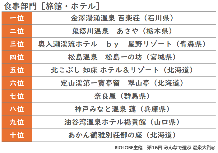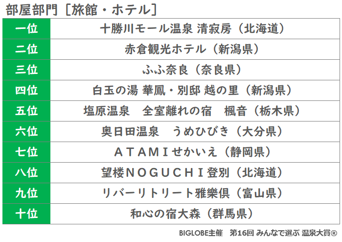 ビッグローブ株式会社(本社:東京都品川区、代表取締役社長:山田 靖久、以下 BIGLOBE)は、旅行比較サイト・アプリ「BIGLOBE旅行( https://travel.biglobe.ne.jp/ )」(注1)において2024年12月24日から2025年2月13日まで投票を受け付けていた「第16回 みんなで選ぶ 温泉大賞(R)」(以下 温泉大賞)の結果を発表します。