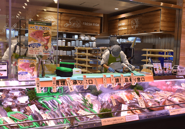 惣菜コーナーではライブキッチンになっており、視覚・聴覚・嗅覚でおいしさをお届けいたします。