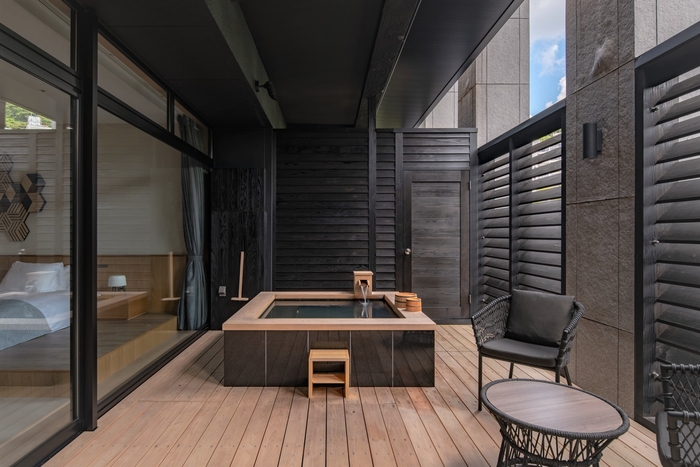 客室テラスの露天風呂スペースの傍にソファースペースを設置し、