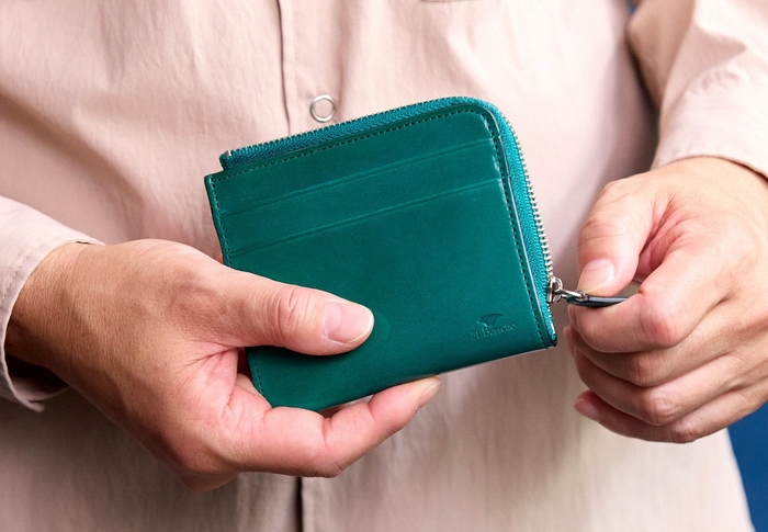 シームレス技法が美しいカーブを生む特徴的なデザインのコインケース。アンティークグリーンカラーは手元が華やかに。